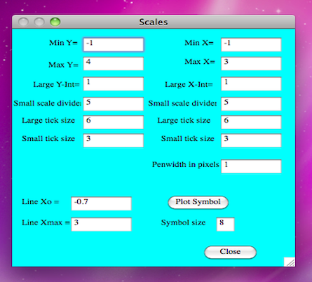 You do not need to make changes for the test data just close the"Change scales etc" window and select "Redraw". This is a good time to try out the different scales Box, YX and 0,0. The 0,0 scale allows you to plot graphs with both the x and y axes passing through zero.